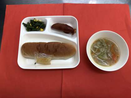 今日の献立は、「フランクフルトのケチャップソース」「スープ」「さんどまめとコーンのサラダ」「コッぺパン」「マーマレードジャム」「牛乳」です。明日は、肉じゃがが登場します。