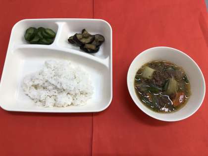 今日の献立は、「肉じゃが」「焼きなすのみそだれかけ」「あっさりきゅうり」「ごはん」「牛乳」です。旬のなすを焼き物機で焼いた後、手作りのたれをかけています。