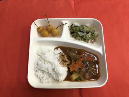 今日の献立は、「ハヤシライス(米粉)」「キャベツのひじきドレッシング」「さくらんぼ(缶)」「牛乳」です。今月のハヤシライスは、小麦アレルギーのある子どもたちも食べられるように、上新粉(米粉)でとろみをつけています。