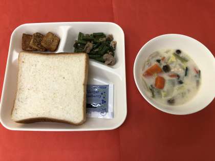今日の献立は、「はくさいのクリーム煮」「あつあげのごまじょうゆかけ」「豚肉とさんどまめのオイスターソースいため」「食パン」「ブルーベリージャム」「牛乳」です。でんぷんでとろみをつけたクリーム煮は、体のあたたまるメニューです。