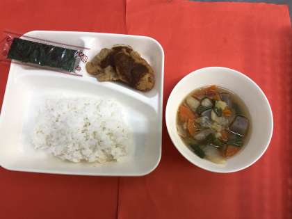 今日の献立は、「みそカツ」「じゃがいもと野菜の煮もの」「焼きのり」「ごはん」「牛乳」です。好評なみそカツは、1人2切ずつ手作りのフライにします。子どもたちは、手作りにとても驚いていました。