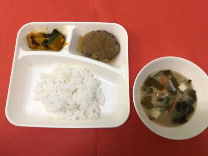 今日の献立は、「和風おろしハンバーグ」「みそ汁」「かぼちゃのいとこ煮」「ごはん」「牛乳」です。かぼちゃのいとこ煮は、味つけしたかぼちゃに、あずき(ドライパック)を合わせて煮含めています。明日は、「なすのミートグラタン」が登場します。