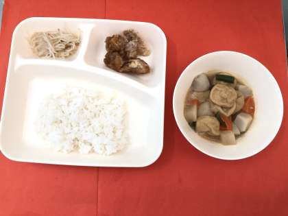 今日の献立は、「あげどりのねぎだれかけ」「含め煮」「もやしのゆずの香あえ」「ごはん」「牛乳」です。鶏肉にでんぷんをまぶして揚げた「あげどりのねぎだれかけ」は子どもたちにとても好評でした。明日は、ほたて貝のクリームシチューが登場します。