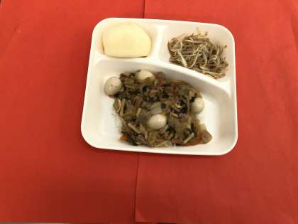 今日の献立は、「中華丼」「もやしの中華あえ」「りんご」「牛乳」です。丼は、子どもたちにとても好評な献立です。