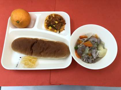 今日の献立は、「豚肉とキャベツのスープ煮」「変わりピザ」「みかん」「コッぺパン」「マーマレード」「牛乳」です。変わりピザは、ツナ、コーン、ピーマン、ピザソース、チーズを混ぜ合わせたものをぎょうざの皮に給食室で1枚ずつのせて焼いた、一口サイズのピザです。子どもたちに人気があります。