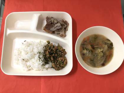 今日の献立は、「さけとこまつなのご飯」「豚肉とれんこんの甘辛焼き」「冬野菜のみそ汁」「牛乳」です。平成30年度の学校給食献立コンクール優秀賞をもとにした献立です。献立のねらいは、「野菜をいっぱい使って、5・6時間目も勉強ががんばれるような給食です。」