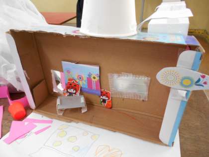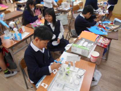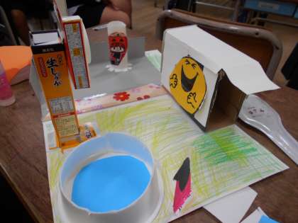箱を使って 学校や温泉など それぞれ考えて まちをつくっていました