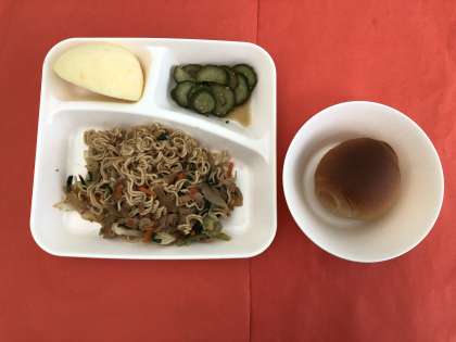 今日の献立は、「オイスターソース焼きそば」「きゅうりの中華あえ」「りんご」「黒糖クレセントロール」「牛乳」です。めん献立のバリエーションが増えました。