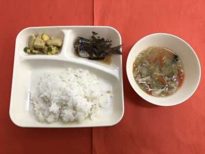 今日の献立は、「いわしのしょうが煮」「うすくず汁」「高野どうふの卵とじ」「ごはん」「牛乳」です。2年生の教室では、「いわしの骨が上手に取れたよ」と子どもたちが誇らしげにみせてくれました。子どもたちは、給食を通しても上手に食べれるようになっていきます。