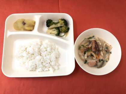 今日の献立は、「かす汁」「ブロッコリーのしょうがづけ」「くりきんとん」「ごはん」「牛乳」です。かす汁は、具だくさんで体の温まる汁物です。