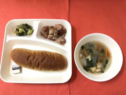 今日の献立は、「鶏肉のオイスターソース焼き」「えびととうふのスープ」「チンゲンサイのピリ辛あえ」「コッぺパン」「バター」「牛乳」です。オイスターソースは、中国料理の調味料です。