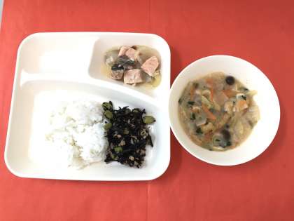 今日の献立は、「栄養たっぷりえだまめひじきご飯」「さけのさわやかレモン焼き」「冬野菜のみそ汁」「牛乳」です。平成30年度学校給食献立コンクール最優秀賞をもとにした献立です。児童の考えた献立のねらいは「色どりを意識して、見た目も味も食感も楽しんでもらう健康メニューを考えました」です。