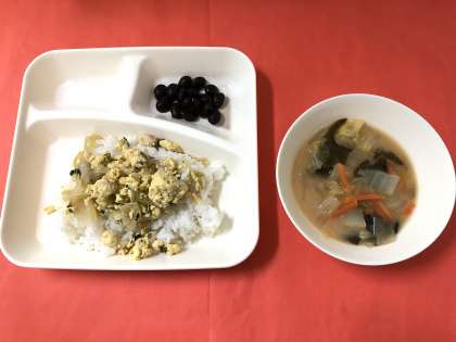 今日の献立は、「親子丼」「みそ汁」「黒豆の煮もの」「牛乳」です。おせち料理の一つの黒豆の煮ものは、まめ(健康的)に暮らせるようにとの願いがこめられています。