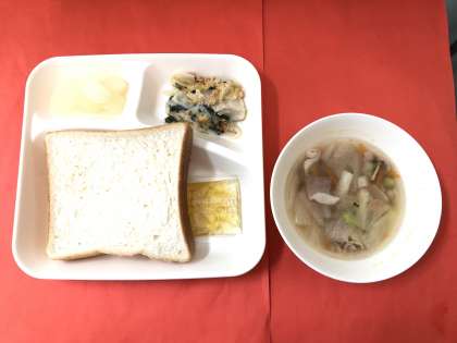 今日の献立は、「マカロニグラタン」「だいこんのスープ」「和なし(カット缶)」「食パン」「マーマレード」「牛乳」です。