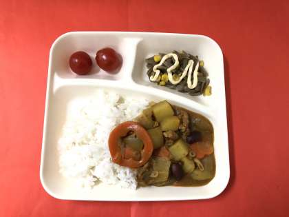 今日の献立は、「豚肉と金時豆のカレーライス」「ごぼうサラダ」「プチトマト」「牛乳」です。ドライパックの金時豆を使用したカレーライスです。