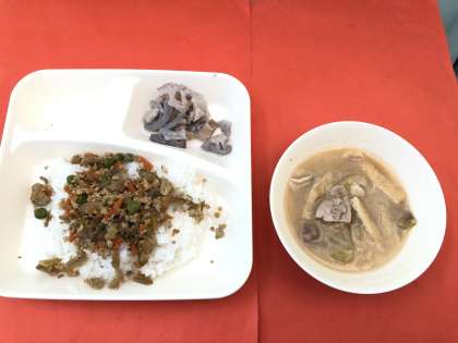 今日の献立は、「鶏ごぼうご飯」「みそ汁」「焼きれんこん」「牛乳」です。鶏ごぼうご飯は、具だくさんの混ぜご飯で、子どもたちに好評な献立です。焼きれんこんは、旬のれんこんの素材の味を味わう一品です。