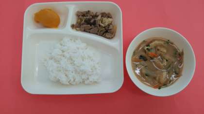 今日の献立は、「豚肉とまいたけのいためもの」「つみれ汁」「かぼちゃういろう」「ごはん」「牛乳」です。