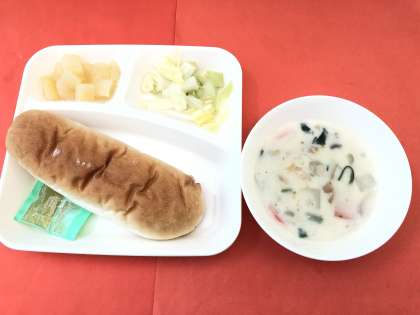 今日の献立は、「ほうれんそうのクリームシチュー」「キャベツのサラダ」「洋なし(カット缶)」「コッぺパン」「りんごジャム」「牛乳」です。クリームシチューは、ほうれんそうの他にエリンギ等を使用し子どもたちに人気の献立です。手作りのルウとクリームでコクを出しています。