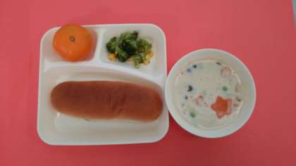 きのこはカロリーが低く、ビタミンB1やビタミンB2、ビタミンD、食物繊維などが多く含まれています。給食では、しいたけ・しめじ・エリンギ・マッシュルーム・まいたけなどが登場します。今日は生のしいたけとしめじを使用し、牛乳と生クリームを加えてコクのある仕上がりにしたシチューです。ラッキーにんじんが入っています。