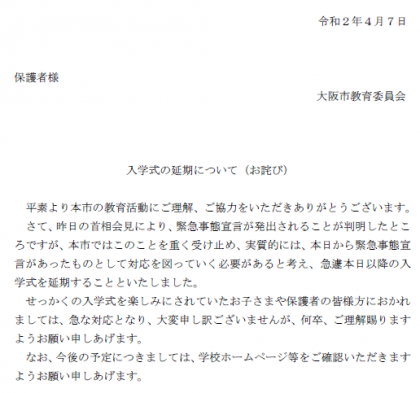 大阪市教育委員会から保護者の皆様へのお詫びに関する文書が届きました。ご確認ください。よろしくお願いします。