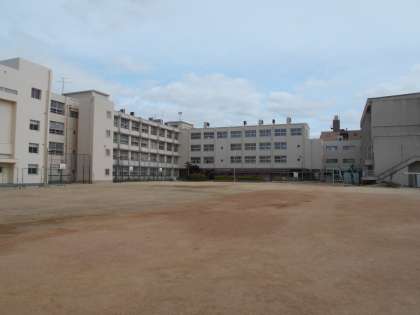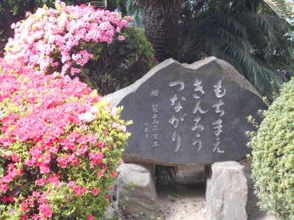 正門を入ると、本校の校訓「もちまえ、きんろう、つながり」と刻まれた石碑があります。その横には皆さんを今か今かと待つようにきれいなツツジが咲いています。