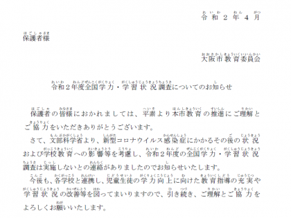 例年6年生が取り組む「全国学力・学習状況調査」について、「今年度は中止」との通達がありました。よろしくお願いします。