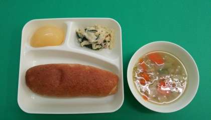冬野菜のひとつ、ほうれん草を用いたグラタンです。下ゆでして鮮やかな緑色を残したほうれん草は、ホワイトグラタンの色のアクセントになっており、ホワイトソースのからみ具合もよいツイストの形をしたマカロニとともに目でも楽しめる献立です。