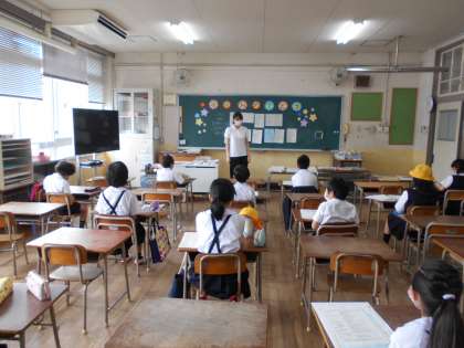 10:30に3年生各クラスの出席番号後半の児童が登校しました。玄関では大きな声であいさつをしてくれました。2ヵ月と12日振りでお友達に会いました。担任の先生とは初顔合わせです。新しいクラスで少し緊張している児童もいました。4月に配布された宿題を提出し、新しい宿題をもらっていました。この休みの間に背が伸びていた児童もいました。