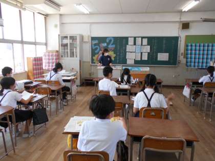 今日は5年生の登校日です。各クラス出席番号後半の児童が10:30に登校しました。玄関では大きな声であいさつをしてくれました。担任の先生とは初の顔合わせです。背も伸びている児童もおり、しっかりと担任の先生の話を聞いていました。
