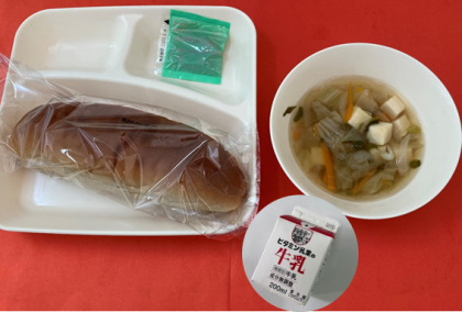 「五目汁 黒糖パン リンゴジャム 牛乳」です!