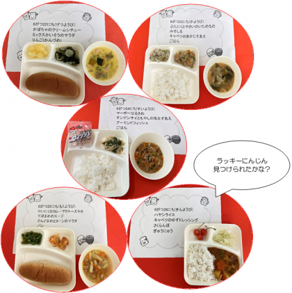 先週の給食献立のご紹介をします。ハヤシライスには、ラッキーにんじんが隠れていました。今回のラッキーにんじんは「桜」の形をしていました!