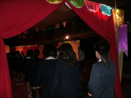 弁天小学校の講堂がサーカス会場に。薄暗い入口でピエロのお姉さんに「チョキン」と指でチケット(掌)にはさみを入れてもらうと、そこはもう『サーカスのライオン』の世界。子ども達は、食い入るように舞台を見つめ、時には「ジンザ、飛び降りて!」「ジンザ!がんばれ!」と思わず声が出ていました。