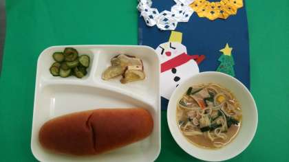 献立は「みそラーメン」「焼きさつまいもの甘みつかけ」「きゅうりの辛みづけ」「黒糖コッペパン」「牛乳」です。子どもたちに人気のメニューです。3学期も楽しみと笑顔で言ってました。
