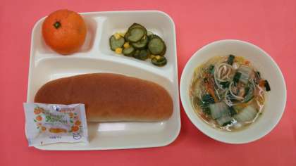 今日の献立は「チャンポン」「きゅうりとコーンの中華あえ」「みかん」「コッペパン」「牛乳」です。「チャンポン」は汁にとろみをつけているので冷めにくく、寒い時期に体の温まる献立です。コッペパンには、昨年から登場したアプリコットジャムがつきます。