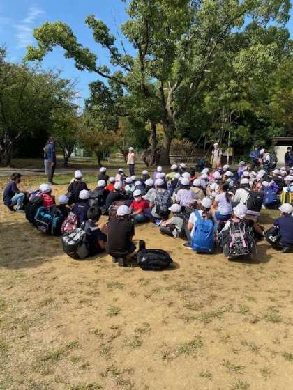 駅から長い上り坂を歩き、信太山青少年野外活動センターにつきました。いよいよ活動が始まります。活動の前に開舎式が行われました。野外活動センターの係りの方の話をしっかりと聞いています。