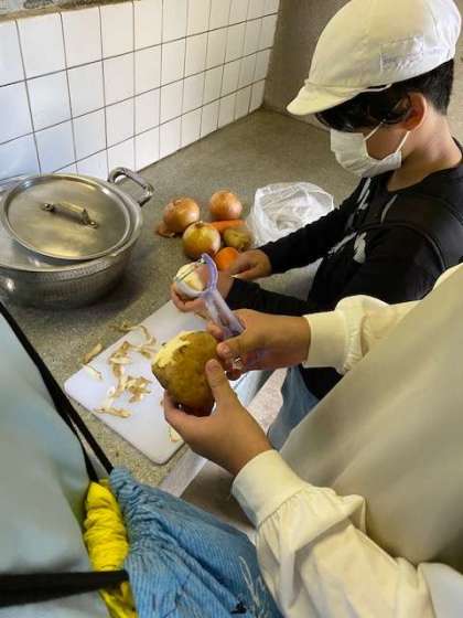 火おこし体験のあとは、いよいよ昼食の準備(カレーづくり)が始まります。野菜の皮をむく係り、米を洗っている係り、火をおこしてまきを入れ火の加減をしてくれている係りの人とチームワーク抜群です。最高のカレーができそうですね。
