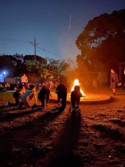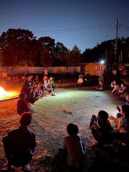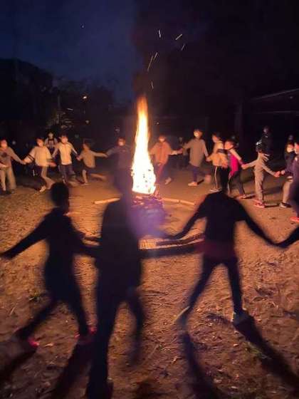 楽しみにしていた1日目の最後の活動であるキャンプファイヤーが楽しく行われました。火の神から各クラスに火をもらい、火を囲んで歌を歌ったりゲームなどをしました。