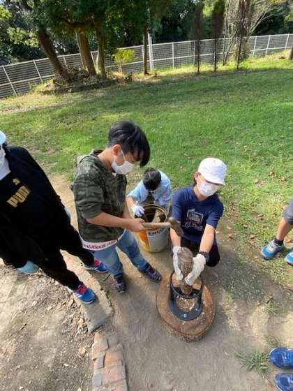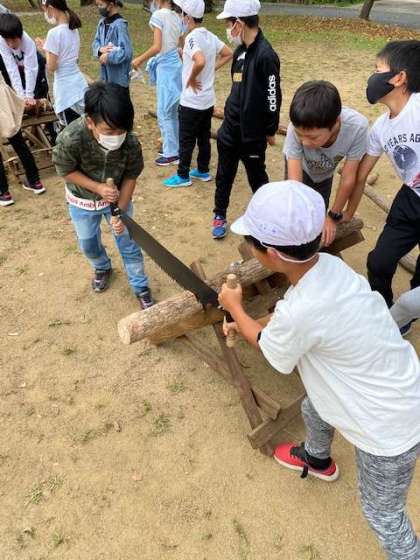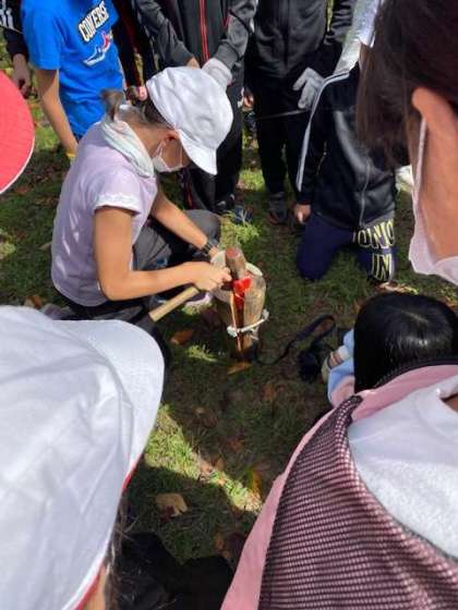 次の昼食(ピザ作り)のために薪割りの体験をしました。係りの方に教えていただきながら薪を割っていました。