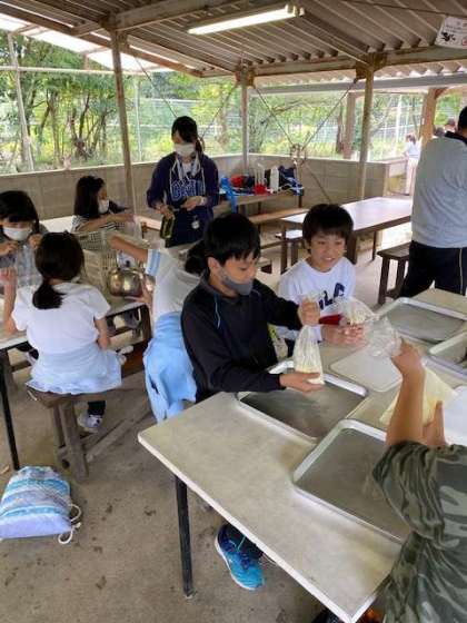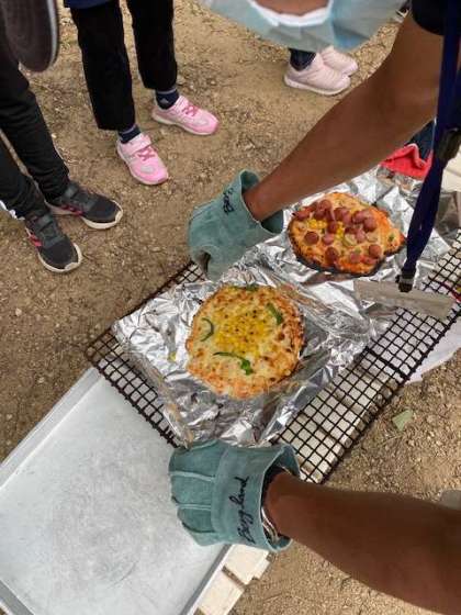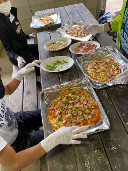 いよいよ昼食です。薪を燃やしピザ作りが始まりました。班で協力して作ったおいしそうなピザができあがりました。