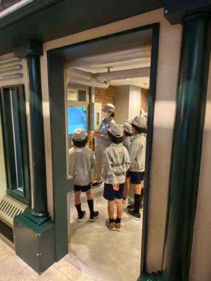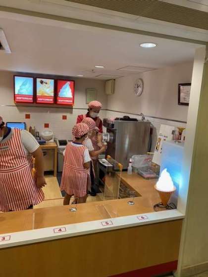 係りの方からの説明を受け真剣に取り組んでいます。ソフトクリームをカップに入れています。