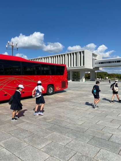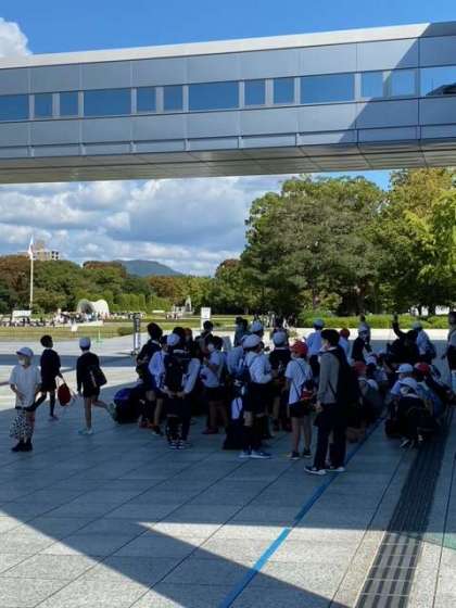 平和記念公園に到着し、資料館前に集合しています。今から資料館内を見学します。