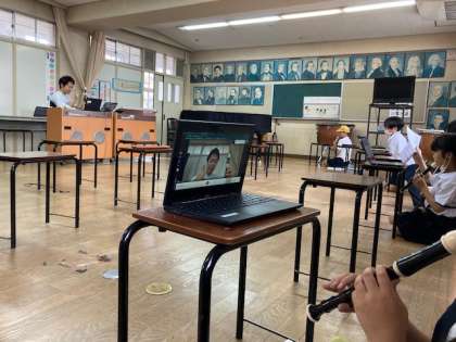18日 14:50〜4年生とmeetを活用しオンラインで音楽科の学習をしました。「花束をあなたに」を歌い、リコーダーで「ソ・ラ・シ」の演奏しました。