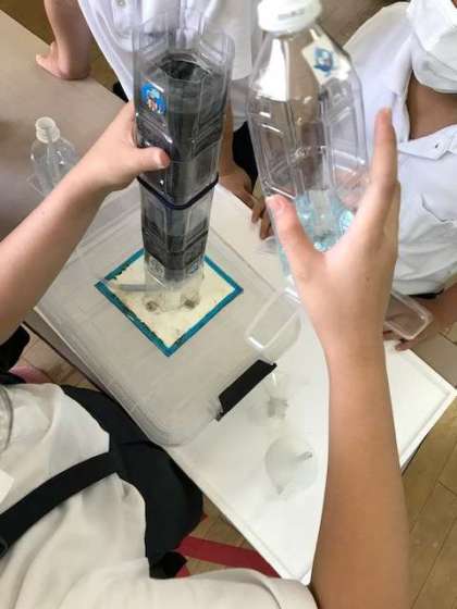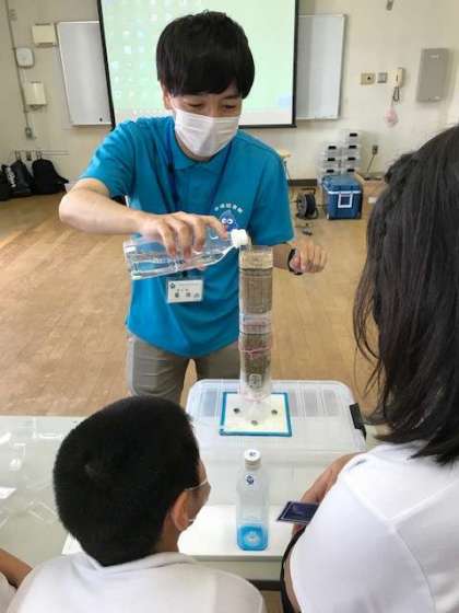4年生の社会科における水についての授業の一環として、柴島浄水場から職員の方に来ていただきました。実験を通して水がきれいになる仕組みを学びました。子どもたちは砂や粒状活性炭を通してろ過された水がきれいになり、においが消える過程を目の当たりにして、一様に驚いた様子でした。