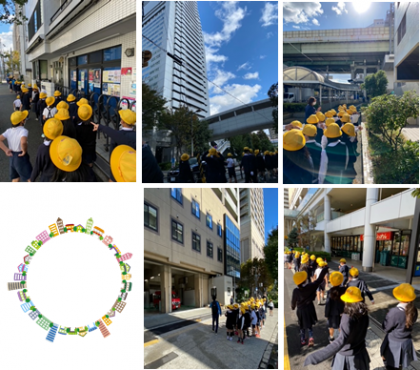 10日 2〜3時間目にかけて、弁天小校区(弁天1〜3丁目)の探検に出かけました。校区には、地域の会館や消防署、駅、ホテル、飲食店など暮らしに必要な施設がたくさんあることがわかりました。子どもたちは列をそろえることを意識して行動することができました。