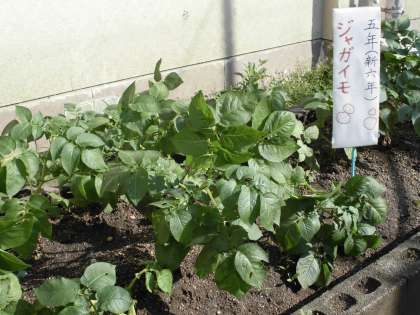6年生が植えたジャガイモが葉をいっぱい茂らせています。土の中はどうなっているのでしょうか?ジャガイモはできているのかな。大きなジャガイモに育ってほしいですね。