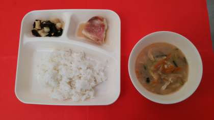 今日の献立は、「赤魚のしょうゆだれかけ」「みそ汁」「わかたけ煮」「ごはん」「牛乳」です。
