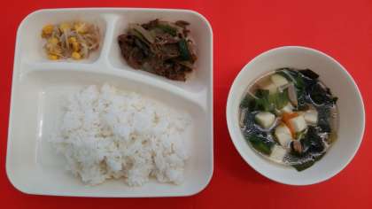 今日の献立は、「プルコギ」「とうふのスープ」「甘酢あえ」「ごはん」「牛乳」です。 「プルコギ」は、毎回子どもたちに好評な献立です。