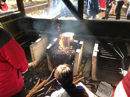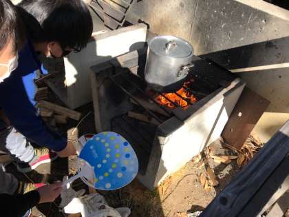 役割分担をしながら薪に火を起こしてご飯を炊いたり、具材の野菜を切ったりして協力する姿が高学年らしいですね!