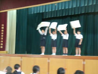 図書館の正しい使い方や本の紹介などをクイズ形式で発表しました。