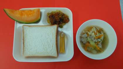 今日の献立は、「カレードリア」「キャベツのスープ」「クインシーメロン」「食パン」「はちみつ」「牛乳」です。
